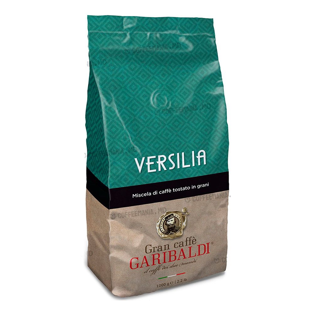 GARIBALDI Versilia 1 kg — boabe de cafea italiană cu aromă intensă de ciocolată cu lapte și corp plin. Tip: boabe. Compoziție: 30 % Arabica + 70 % Robusta. Ambalaj: 1 kg.