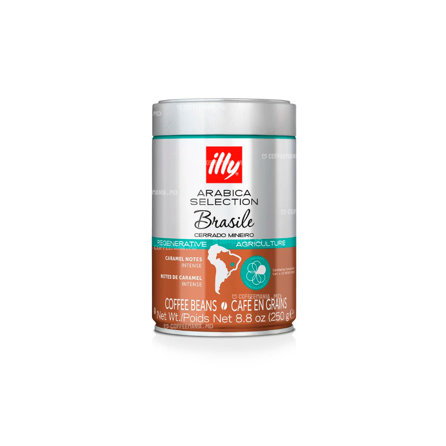 Cafea boabe ILLY Espresso Arabica Selection - Brasile 250g – 100% Arabica, provenită din Brazilia. Gust intens cu note de caramel, cultivată sustenabil, păstrată în conserve presurizate.