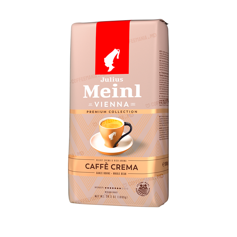Julius Meinl Premium Collection Caffè Crema conține Arabica și Robusta, oferind o cremă catifelată și un gust intens cu note de alună.