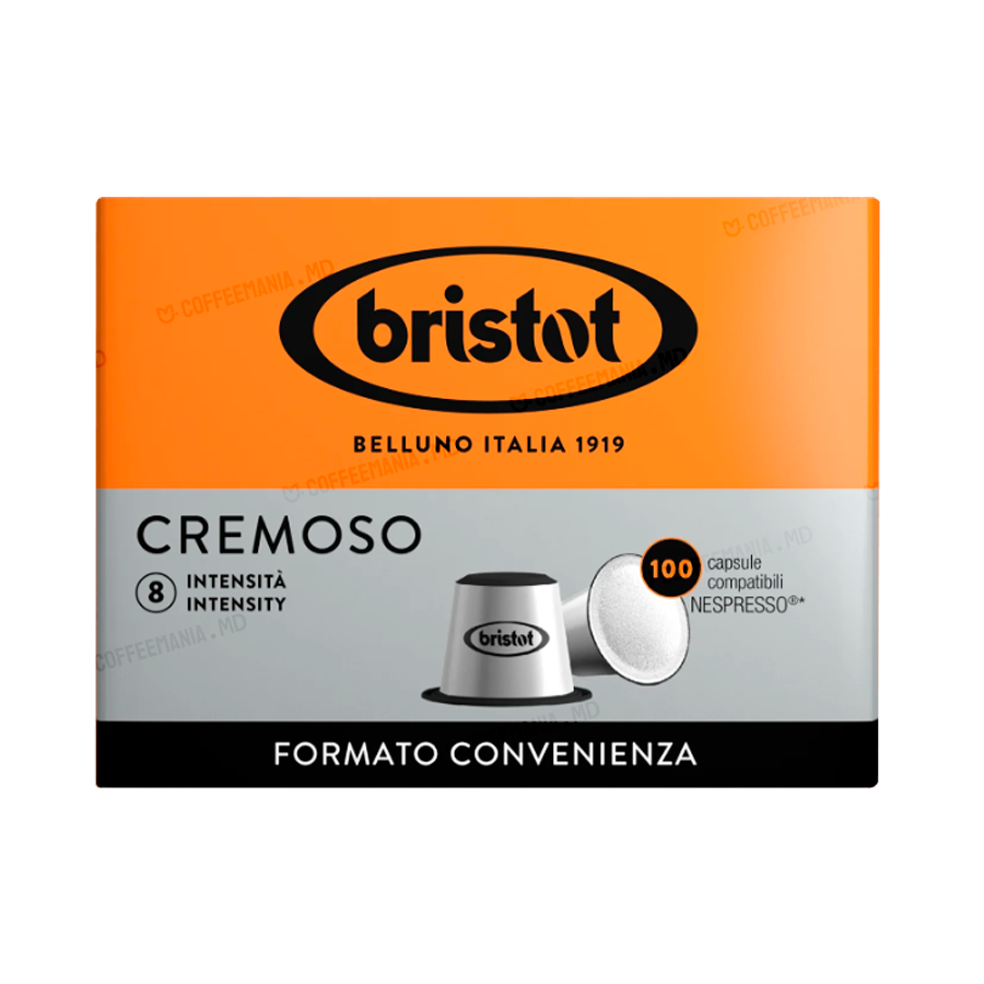 Capsule Nespresso BRISTOT Cremoso, cu gust cremos și note de ciocolată și pâine prăjită, 100 capsule, 550 g.