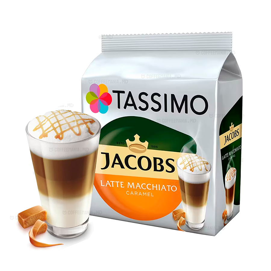 Jacobs Tassimo Latte Macchiato Caramel – băutură stratificată cu lapte și caramel, compatibilă cu aparatele Tassimo.
