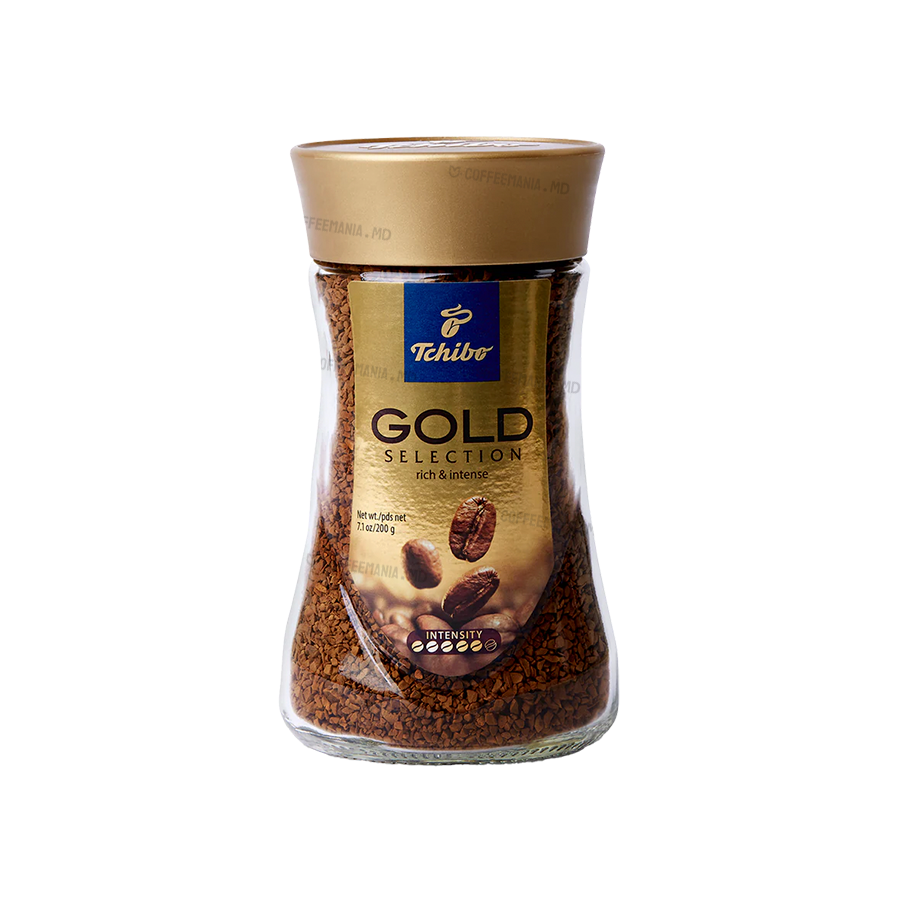 Cafea solubilă Tchibo Gold Selection 100g – gust intens și aromă fină. Prăjire germană, ambalaj sigilat.