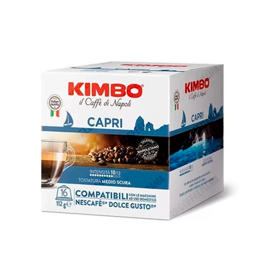 Capsule KIMBO Capri cu note de biscuiți, vanilie și fructe uscate, prăjire mediu-întunecată. Compatibile Dolce Gusto, perfecte pentru cafea cu caracter.
