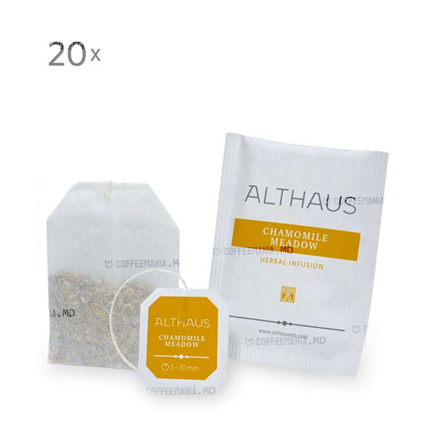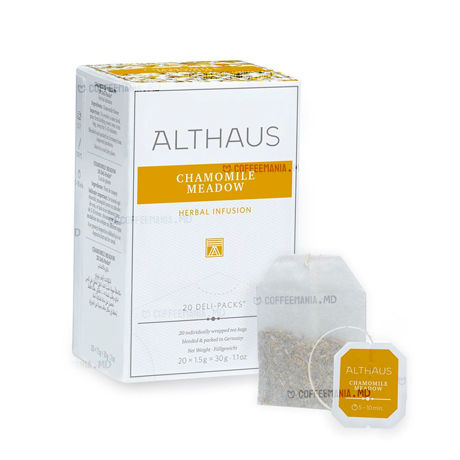 Althaus Camomile Meadow – un ceai de plante premium, realizat din flori de mușețel atent selecționate. Infuzia sa delicată oferă un gust floral dulceag, cu accente de miere naturală, ideal pentru relaxare și confort. Fără cofeină, potrivit pentru orice moment al zilei.