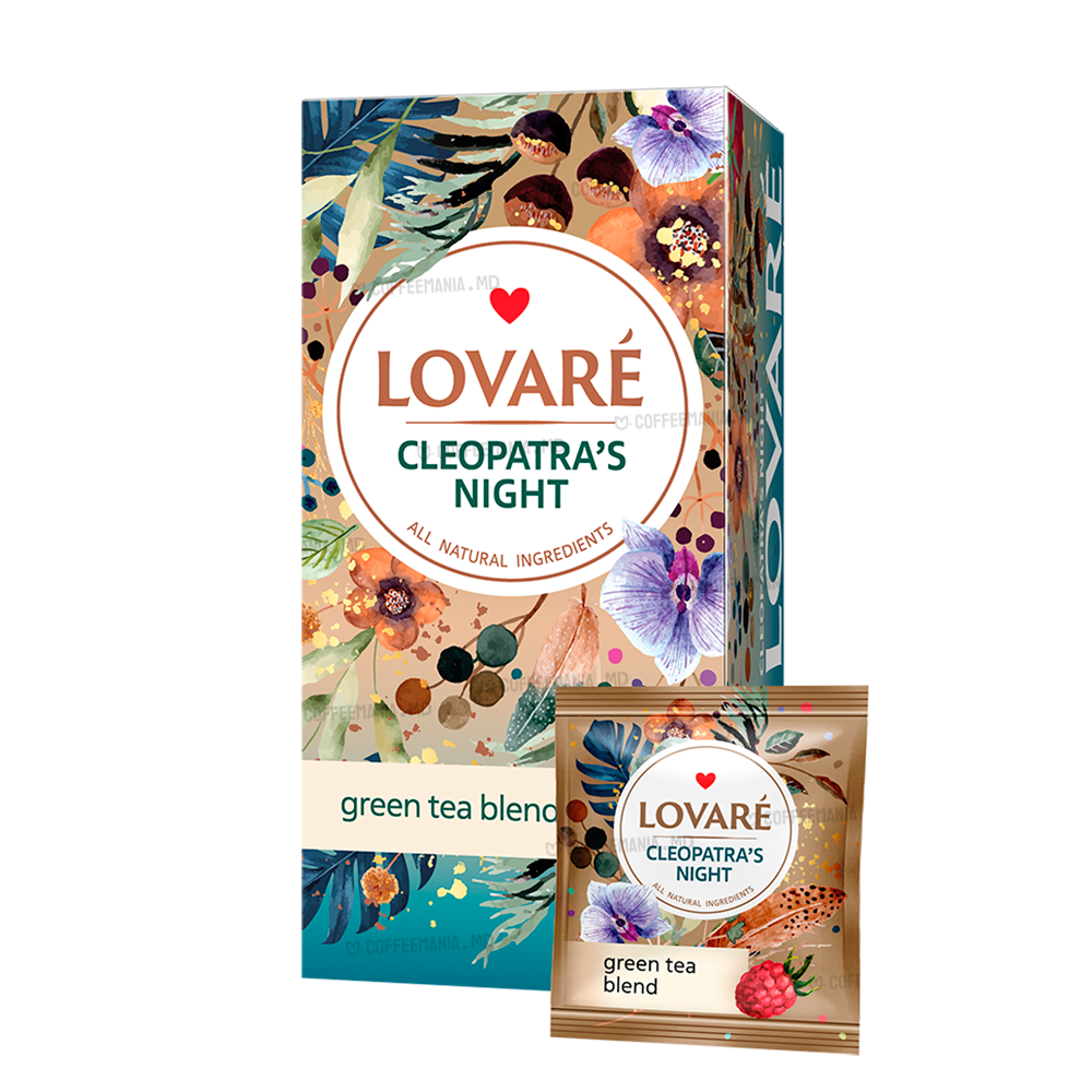 Lovare Cleopatra’s Night (24 plicuri) — ceai verde aromatizat cu ananas, mere și petale florale. Aroma fructat‑florală delicată. Plicuri individuale.