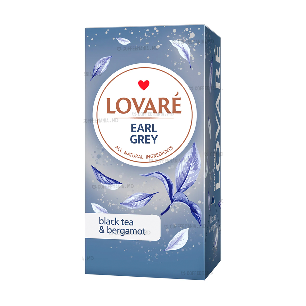 Lovare Earl Grey (24 plicuri) — ceai negru clasic, aromat cu ulei natural de bergamotă, într-un ambalaj de 24 plicuri individuale (2 g fiecare). Gustul bine echilibrat între tăria ceaiului negru și notele citrice luminoase oferă o experiență elegantă la fiecare ceașcă.