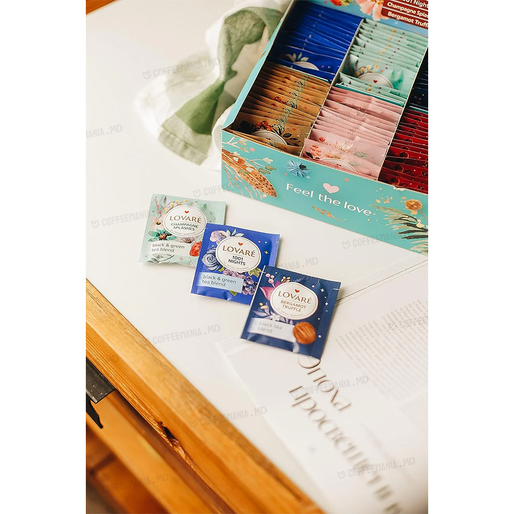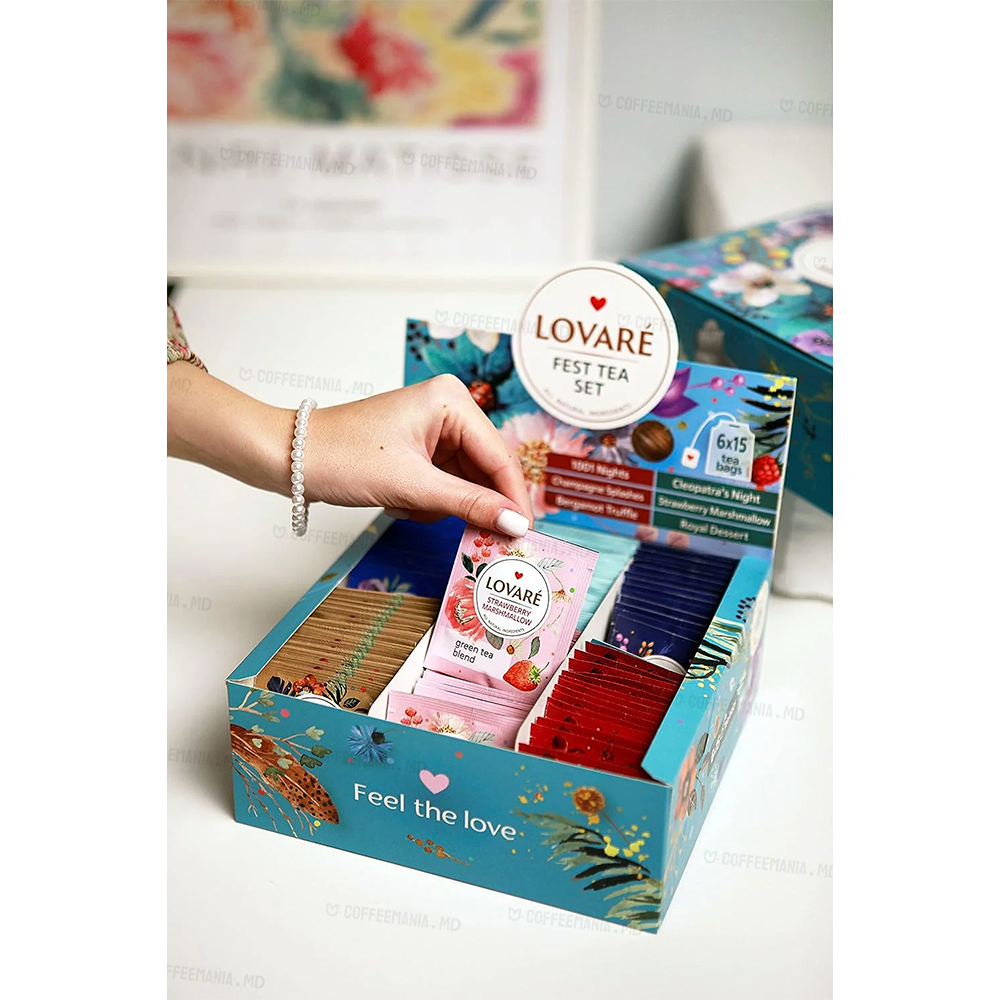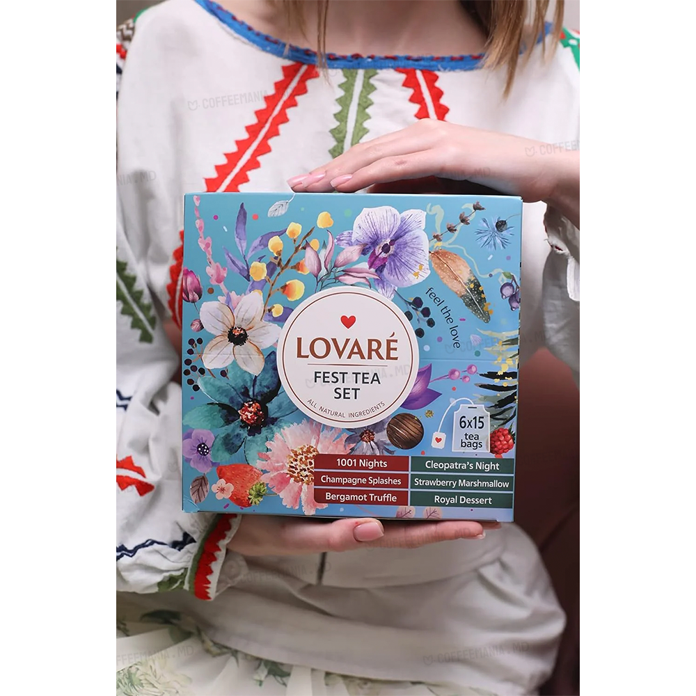 Lovare Set FEST TEA — colecție festivă de ceaiuri cu 6 arome distincte (total 90 plicuri), care îmbină ceaiuri negre, verzi și infuzii florale-fructate. Fiecare aromă adaugă culoare și diversitate: de la combinații delicate de fructe și petale, până la accente surprinzătoare cu trufe și bergamot. Este setul ideal pentru varietate la ocazii speciale sau pentru degustare extensivă.