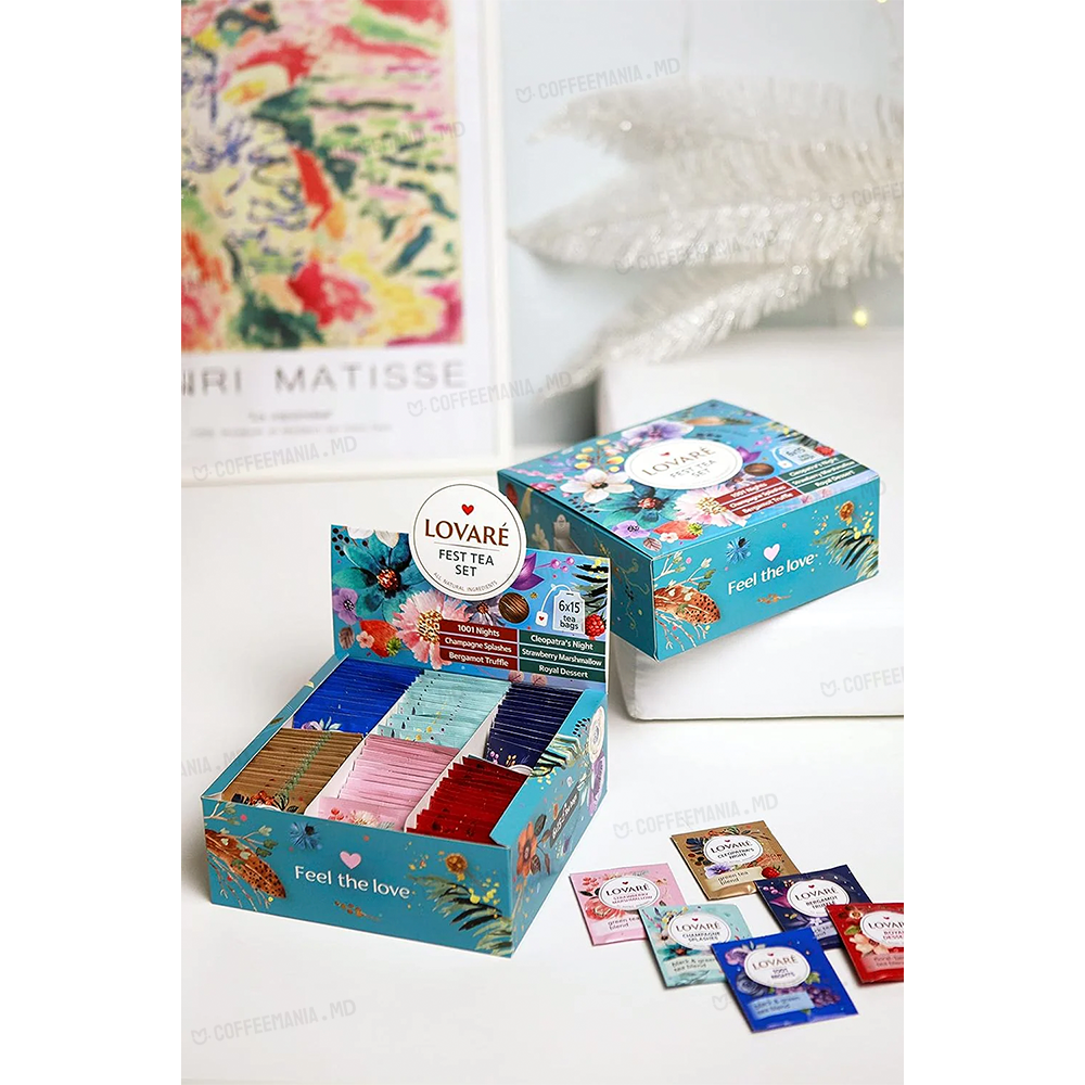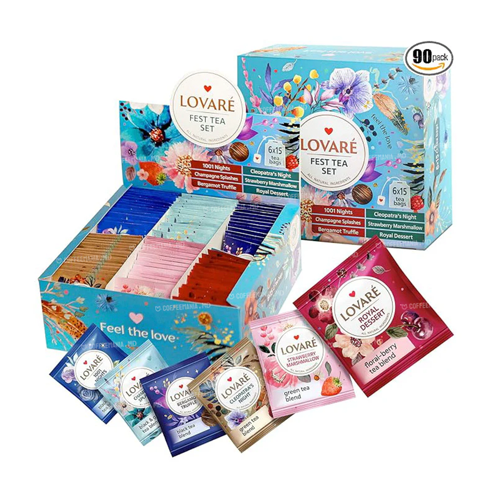 Lovare Set FEST TEA — colecție festiva de 90 plicuri cu 6 arome distincte: 1001 Nights, Splashes, Truffle‑Bergamot, Strawberry Marshmallow, Cleopatra’s Night, Royal Dessert. Gusturi variate, ambalaj elegant.