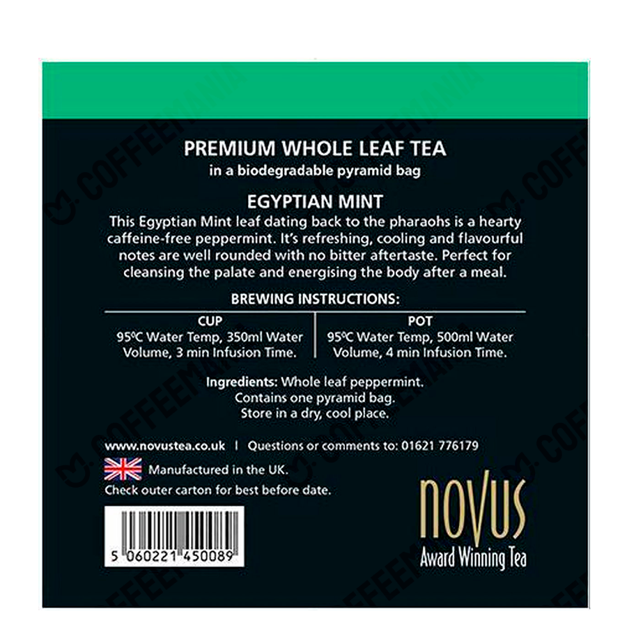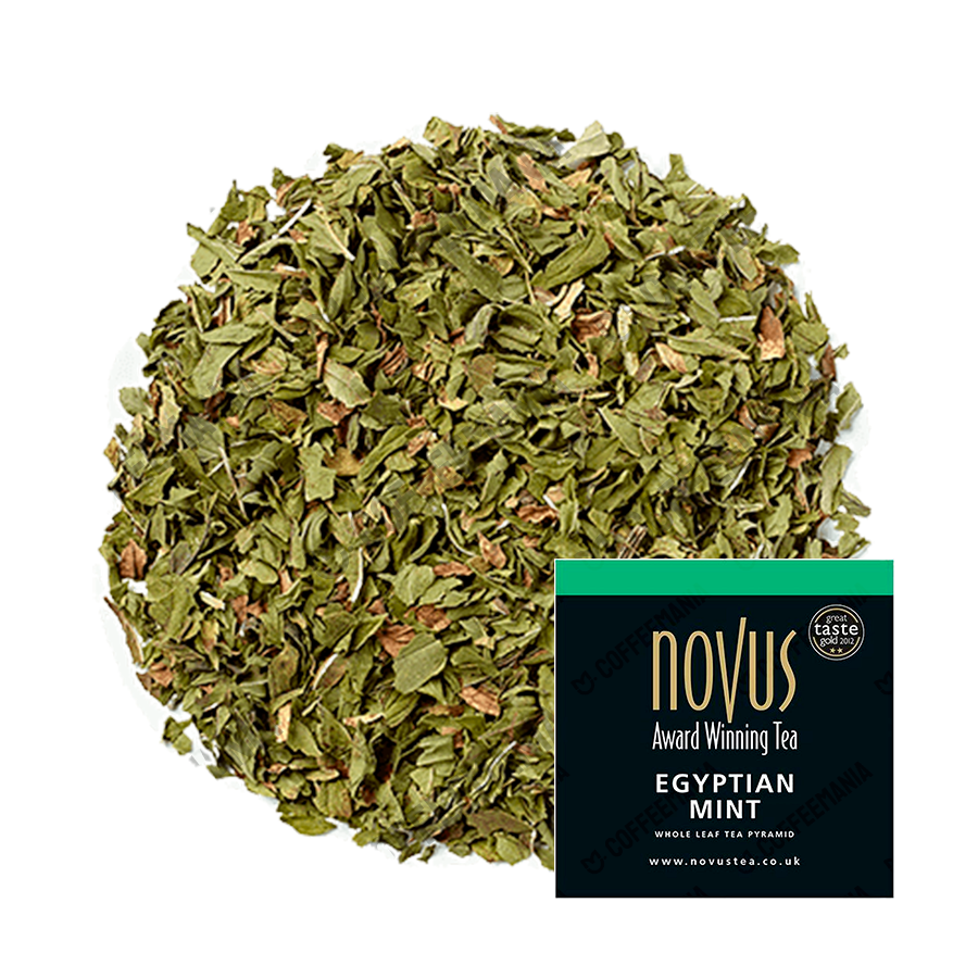 Novus Egyptian Mint Tea este o infuzie de mentă premium, fără cofeină, bazată pe o rețetă tradițională egipteană. Acest ceai oferă o aromă răcoritoare și revigorantă, cu note puternice de mentă, fără gust amar. Ideal pentru a curăța palatul și a energiza corpul după masă.